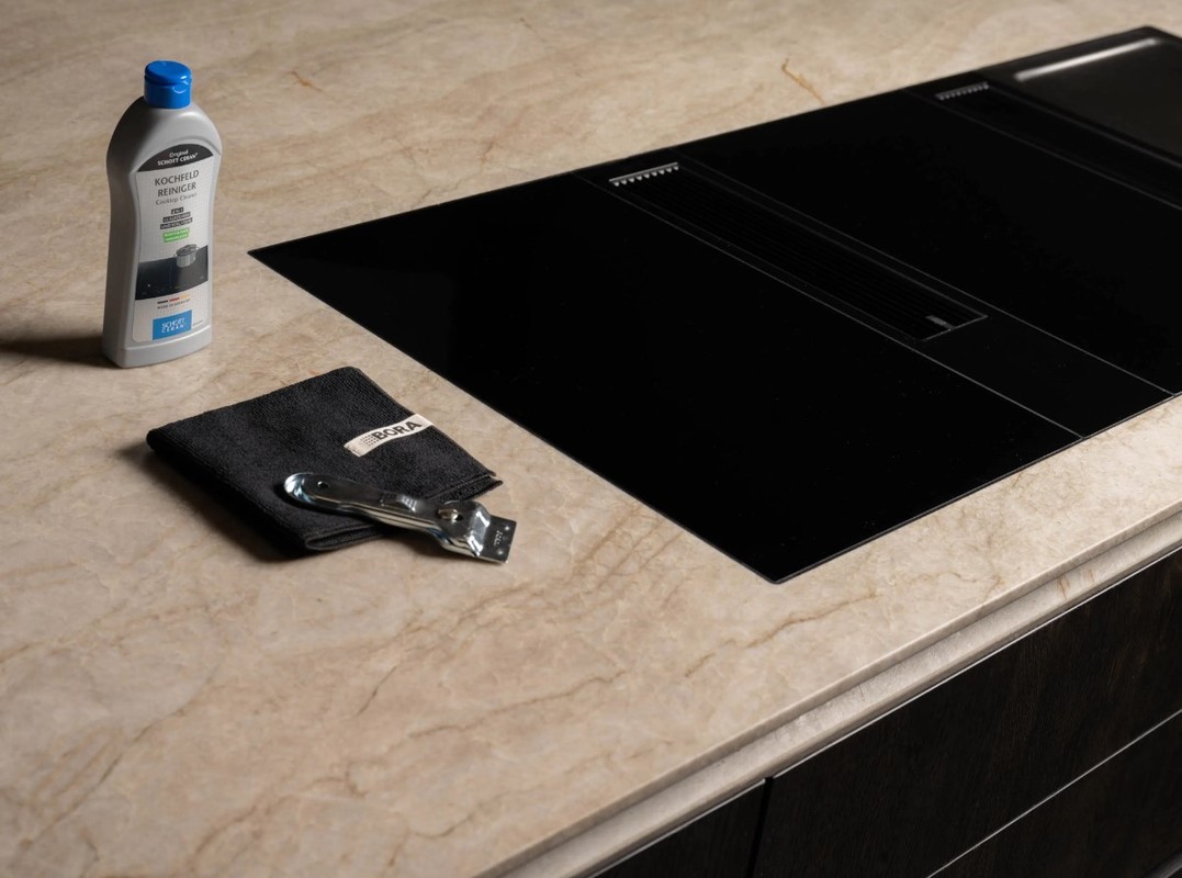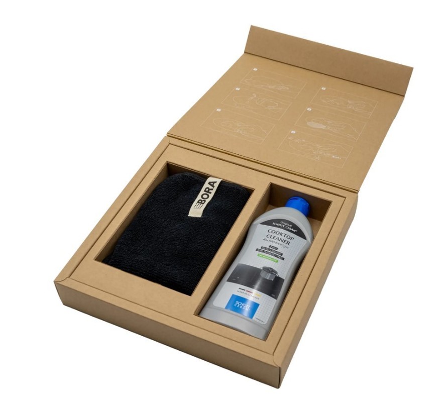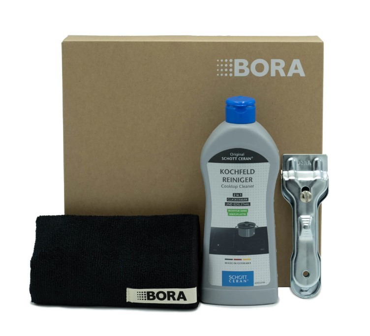 Po kuhanju uporabite čistilni set BORA, da bo vaša kuhalna plošča ponovno videti kot nova. Komplet vsebuje čistilo za kuhalno ploščo, elegantno črno krpo iz mikrovlaken BORA in steklokeramično strgalo iz nerjavečega jekla za nežno odstranjevanje trdovratnih ostankov hrane s kuhalne plošče.