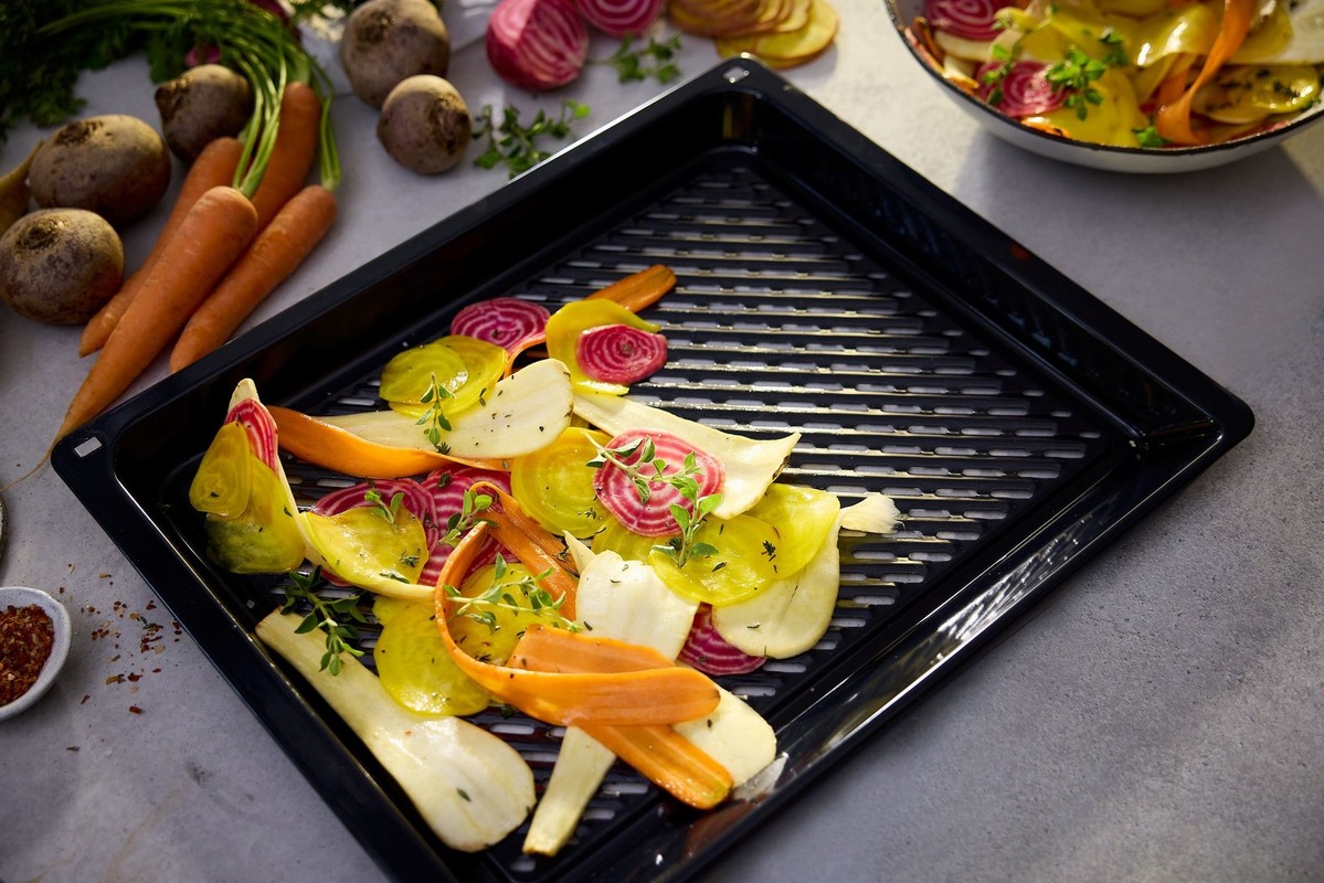 Priporočamo, da na najnižjo raven dodate pekač, ki je idealen za uporabo kot pladenj za zbiranje tekočine pri pripravi jedi s sistemoma Air Fry in Grill.