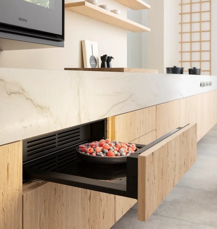 Minimalistični dizajn večnamenskega predala BORA ne vključuje vsega odvečnih elementov in navdušuje s površino brez ročajev. Diskretno se integrira v vsako sodobno kuhinjo. Dizajn »All Black« steklene sprednje plošče BORA daje sodoben videz – zlasti v kombinaciji s parno pečico BORA X BO, ki je na voljo v istem videzu.