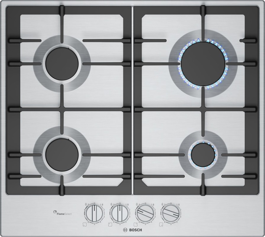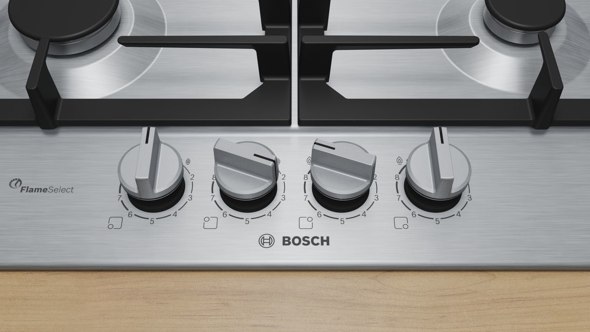 Plinska kuhalna plošča z natančnim nadzorom plamena in enostavnim čiščenjem zahvaljujoč snemljivim kovinskim gumbom in litoželeznim nosilcem za posodo, primernih za pomivanje v pomivalnem stroju.