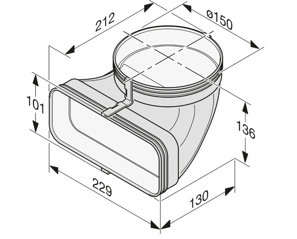 • Kompakten kotni-okrogli adapter 90°, glob. 130 mm, višina 136 mm